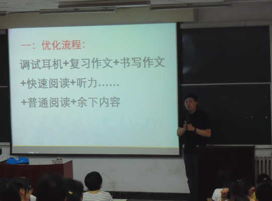 为迎接四、六级英语考试,帮助同学们更好的备考,jinnianhui金年会诚信至上6月6日晚七点于正学楼第三大教室举办了英语四、六级考前讲座,讲座特邀国内著名语法词汇专家、美国权威英语测试机构认教师、新浪特邀英语辅导专家韩苏为同学们深度解析英语四、六级考试, 200余人的教室座无虚席。