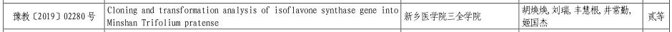 近日,河南省教育厅印发《关于公布 2019 年度科技成果奖奖励名单的通知》(教科技〔2019〕378 号),公布了2019年度河南省教育厅科技成果奖获奖名单。金年会教师胡焕焕发表的论文《Cloning and transformation analysis of isoflavone synthase gene into Minshan Trifolium pratense》荣获二等奖。