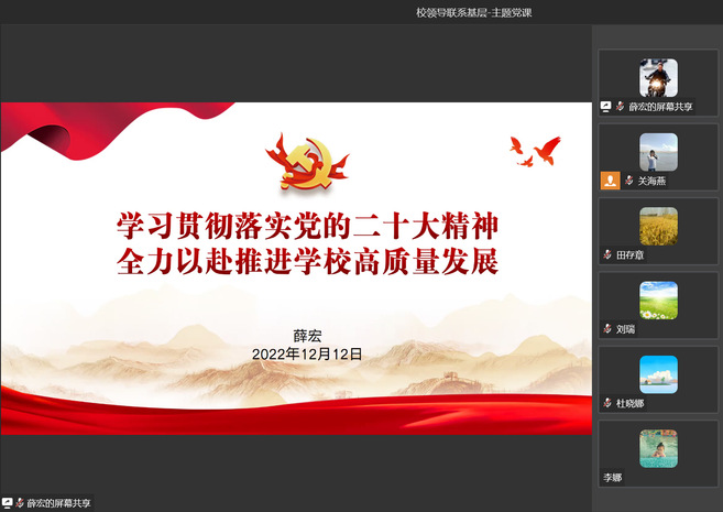 为深入学习党的二十大精神,12月12日上午,我校副院长薛宏以《学习贯彻落实党的二十大精神全力以赴推进学校高质量发展》为主题,通过线上视频会议形式为jinnianhui金年会诚信至上教师上了一堂精彩的党课。发酵...