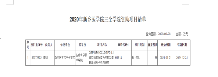 近日,国家自然科学基金委员会公布了《关于2020年度国家自然科学基金申请项目评审结果的通告》,金年会李明教授的《GBP1通过CCL2和PD-L1调控脑胶质瘤免疫抑制微环境的分子机制研究》获准医学科学类立项,资...